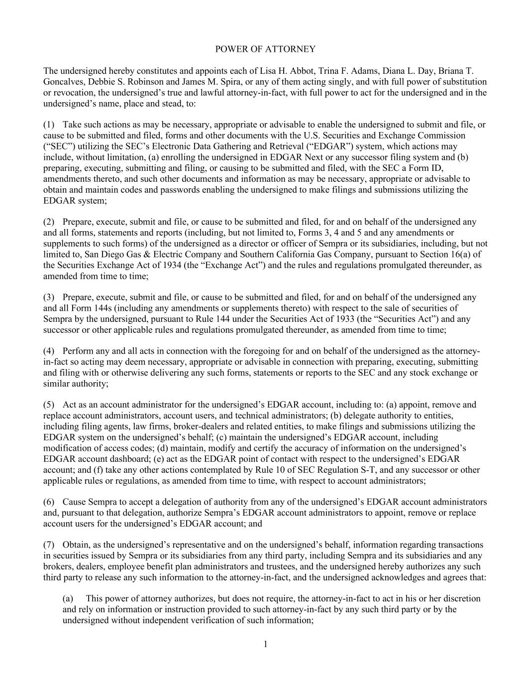1 POWER OF ATTORNEY The undersigned hereby constitutes and appoints each of Lisa H. Abbot, Trina F. Adams, Diana L. Day, Briana T. Goncalves, Debbie S. Robinson and James M. Spira, or any of them acting singly, and with full power of substitution or revocation, the undersigned’s true and lawful attorney-in-fact, with full power to act for the undersigned and in the undersigned’s name, place and stead, to: (1) Take such actions as may be necessary, appropriate or advisable to enable the undersigned to submit and file, or cause to be submitted and filed, forms and other documents with the U.S. Securities and Exchange Commission (“SEC”) utilizing the SEC’s Electronic Data Gathering and Retrieval (“EDGAR”) system, which actions may include, without limitation, (a) enrolling the undersigned in EDGAR Next or any successor filing system and (b) preparing, executing, submitting and filing, or causing to be submitted and filed, with the SEC a Form ID, amendments thereto, and such other documents and information as may be necessary, appropriate or advisable to obtain and maintain codes and passwords enabling the undersigned to make filings and submissions utilizing the EDGAR system; (2) Prepare, execute, submit and file, or cause to be submitted and filed, for and on behalf of the undersigned any and all forms, statements and reports (including, but not limited to, Forms 3, 4 and 5 and any amendments or supplements to such forms) of the undersigned as a director or officer of Sempra or its subsidiaries, including, but not limited to, San Diego Gas & Electric Company and Southern California Gas Company, pursuant to Section 16(a) of the Securities Exchange Act of 1934 (the “Exchange Act”) and the rules and regulations promulgated thereunder, as amended from time to time; (3) Prepare, execute, submit and file, or cause to be submitted and filed, for and on behalf of the undersigned any and all Form 144s (including any amendments or supplements thereto) with respect to the sale of securities of Sempra by the undersigned, pursuant to Rule 144 under the Securities Act of 1933 (the “Securities Act”) and any successor or other applicable rules and regulations promulgated thereunder, as amended from time to time; (4) Perform any and all acts in connection with the foregoing for and on behalf of the undersigned as the attorney- in-fact so acting may deem necessary, appropriate or advisable in connection with preparing, executing, submitting and filing with or otherwise delivering any such forms, statements or reports to the SEC and any stock exchange or similar authority; (5) Act as an account administrator for the undersigned’s EDGAR account, including to: (a) appoint, remove and replace account administrators, account users, and technical administrators; (b) delegate authority to entities, including filing agents, law firms, broker-dealers and related entities, to make filings and submissions utilizing the EDGAR system on the undersigned’s behalf; (c) maintain the undersigned’s EDGAR account, including modification of access codes; (d) maintain, modify and certify the accuracy of information on the undersigned’s EDGAR account dashboard; (e) act as the EDGAR point of contact with respect to the undersigned’s EDGAR account; and (f) take any other actions contemplated by Rule 10 of SEC Regulation S-T, and any successor or other applicable rules or regulations, as amended from time to time, with respect to account administrators; (6) Cause Sempra to accept a delegation of authority from any of the undersigned’s EDGAR account administrators and, pursuant to that delegation, authorize Sempra’s EDGAR account administrators to appoint, remove or replace account users for the undersigned’s EDGAR account; and (7) Obtain, as the undersigned’s representative and on the undersigned’s behalf, information regarding transactions in securities issued by Sempra or its subsidiaries from any third party, including Sempra and its subsidiaries and any brokers, dealers, employee benefit plan administrators and trustees, and the undersigned hereby authorizes any such third party to release any such information to the attorney-in-fact, and the undersigned acknowledges and agrees that: (a) This power of attorney authorizes, but does not require, the attorney-in-fact to act in his or her discretion and rely on information or instruction provided to such attorney-in-fact by any such third party or by the undersigned without independent verification of such information;